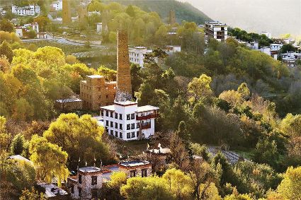甲居藏寨依山面水,紅白相間的民居從大金河谷層層疊疊向上攀援,錯(cuò)落有致的散布在山坡上,樹葉漸次褪綠,漸染紅色,山頂是皚皚白雪,將田園牧歌式的畫卷展示在人們眼前。