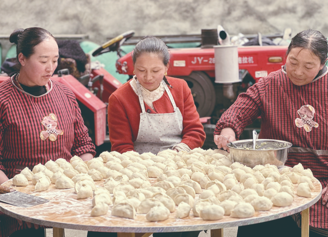 聽到人聲喧嚷時(shí),我來到了辦喜酒的人家門外,一群在藏袍外套了花格子圍裙的婦人正環(huán)繞幾張大木桌做包子——喜宴的早餐。包子因?yàn)轲W子不同而樣式各異,青菜肉餡的像山尖、牛肉洋蔥餡的似頭帕、酥油糌粑餡的團(tuán)成了一個(gè)圓。婦人們一邊做包子一邊說著家長(zhǎng)里短,嘻嘻哈哈的笑聲在院中此起彼落,一群歇在檐下的野雀把那聲音當(dāng)成了另一種鳥鳴,它們慌張地飛離后,又徐徐地飛回。在院墻邊搭建臨時(shí)鍋灶蒸包子的男人們,按時(shí)揭開鍋蓋,霧氣和包子的香氣頓時(shí)升起,他們?nèi)炱鸢?,見有幾個(gè)裂開了口子,似也聽到了婦人們的擺談。
