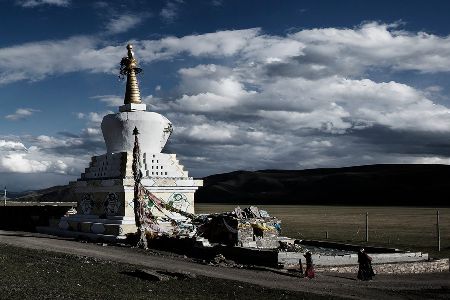 走近了,你會看見砌墻的石片上刻著密密麻麻的經(jīng)文;綿延的墻體上嵌著一個個窗口式的佛龕;每隔一段距離,石墻圍出一個回環(huán)的空間,類似于城墻上的烽火臺;長墻的兩端立著高大的佛塔,中段的108座佛塔排成長長的隊伍,和長墻并行。