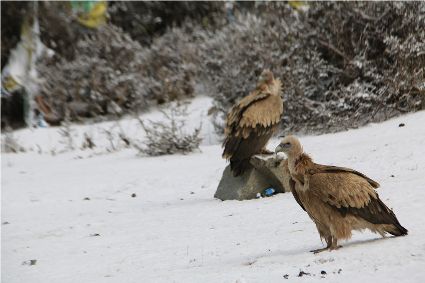 而隨后途經(jīng)中扎科鄉(xiāng),一群禿鷲正在飽食一頭死牛。牛身體內(nèi)流出的鮮血,早已和冰雪中板結(jié)的土層融合在一起。這些來(lái)自天空的使者用自己嘴和腸胃在一頭死去的牛和天空之間交接著某種儀式,它們的背景是雪,是具備凈化色彩的凝結(jié)物。這些禿鷲,它們自身也在從事著凈化的工作。