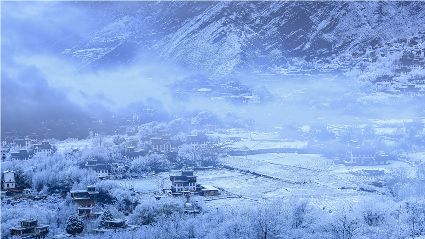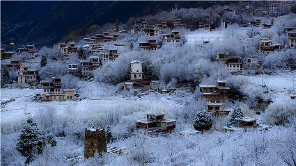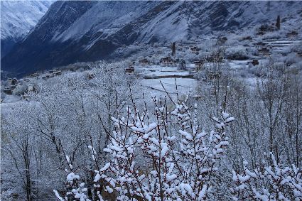 我以這份孤獨(dú)和執(zhí)著,爬上了東邊的山坡。雪停了,微風(fēng)習(xí)習(xí)。櫻桃花、桃花在雪枝頭冷艷,淡淡的幽香徐徐浸入心扉。滿眼望去,一片晶瑩,一片潔白。古碉藏寨在這片世界里,寧?kù)o安詳,不容一絲一毫的驚擾。我懷疑自己進(jìn)入了那種叫做空靈的境界。