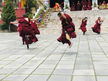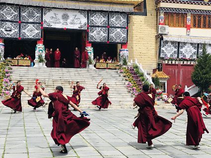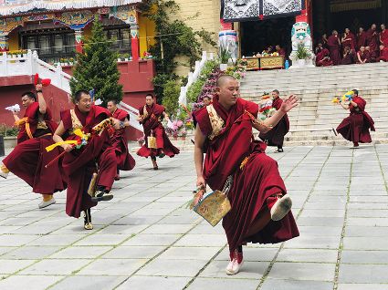 跳神儀式開始,南無寺內(nèi)鼓號齊鳴,喇嘛身著顯耀盛裝,點(diǎn)燃新綠松枝,幾縷藍(lán)色煙紋升起。一支由法鼓、鈸、海螺、法號等組成的寺廟樂隊自大殿而出,順時針繞場一周落座場邊,群神出場繞圈而舞,以示凈化場地,祈請諸神入位。接著,象征護(hù)法神舞、骷髏舞、鹿神舞、黑帽咒師舞和金剛力士舞的演員手持各類法器挨個入場手舞足蹈。舞蹈的起落根 據(jù)場邊奏響的器樂節(jié)奏進(jìn)行。最后由眾神驅(qū)鬼逐邪,押送“朵馬”(由糌粑捏成用以供神施鬼的食品)至寺外拋丟焚燒,以示驅(qū)逐一年的邪魔,祈禱來年安樂。