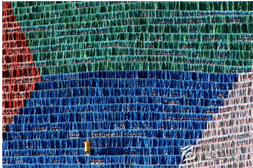 各種顏色的經幡組成了六字箴言的第一個字“嗡”掛在山上,面積約有100多平方米,可以與拉薩大昭寺的大唐卡相媲美!