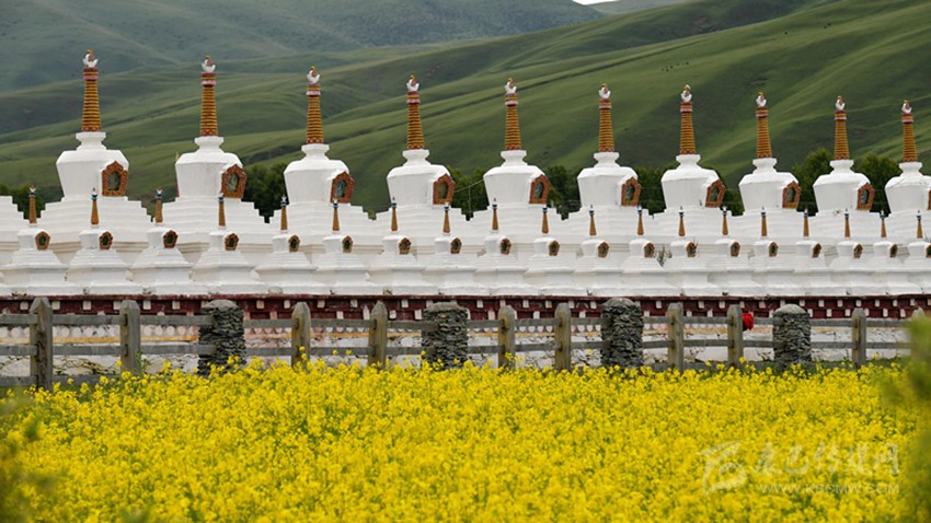 金黃的菜花與青山綠水、藏式民居相融,繪成一幅幅絕美的畫卷。據悉,道孚縣油菜盛花期將持續(xù)一個月。“油菜花開滿地黃,叢間蝶舞蜜蜂忙;清風吹拂金波涌,飄溢醉人濃郁香”。在漫山遍野金黃色的油菜花中,掩映著華麗的藏式建筑,使得每一個逃離紛繁城市的人都能找到歸宿。(圖片由中新社記者 劉忠俊 攝)