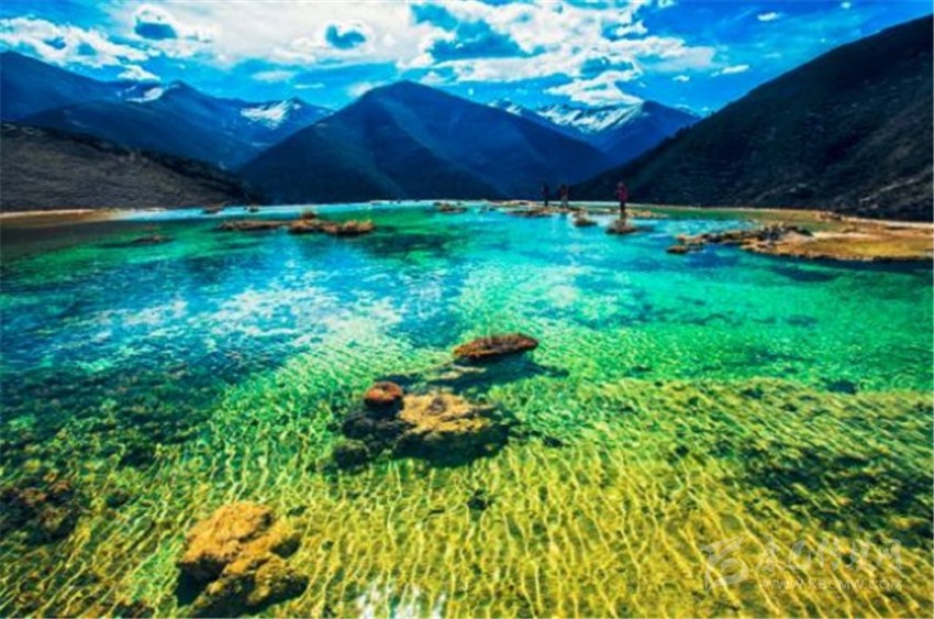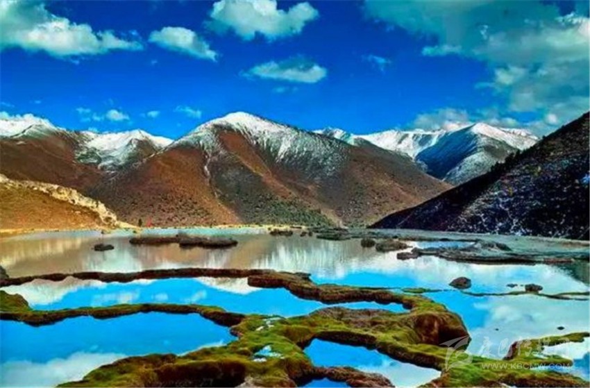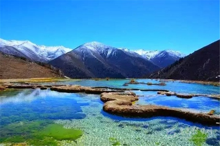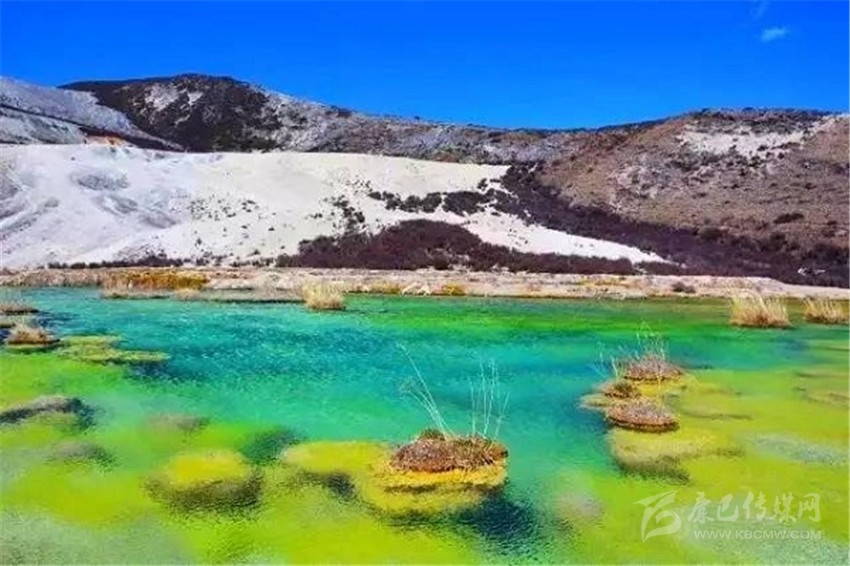 泉華灘海拔約4000米,屬于高山河谷草甸地貌。東南面就是貢嘎山,這里是觀看“蜀山之王”的絕佳位置。它因一種含有大量化學物質(zhì)的泉水在地表產(chǎn)生化學沉淀而成,從另一個山頭傾斜下來大片的白色鈣化土,延伸到谷底后便變化出四層五彩的鈣化池。每個階地上有十幾個大小不同、形態(tài)各異的五色彩池,水深40-70厘米,彩池里水草相依,石花點點,疑為瑤池降臨人間!