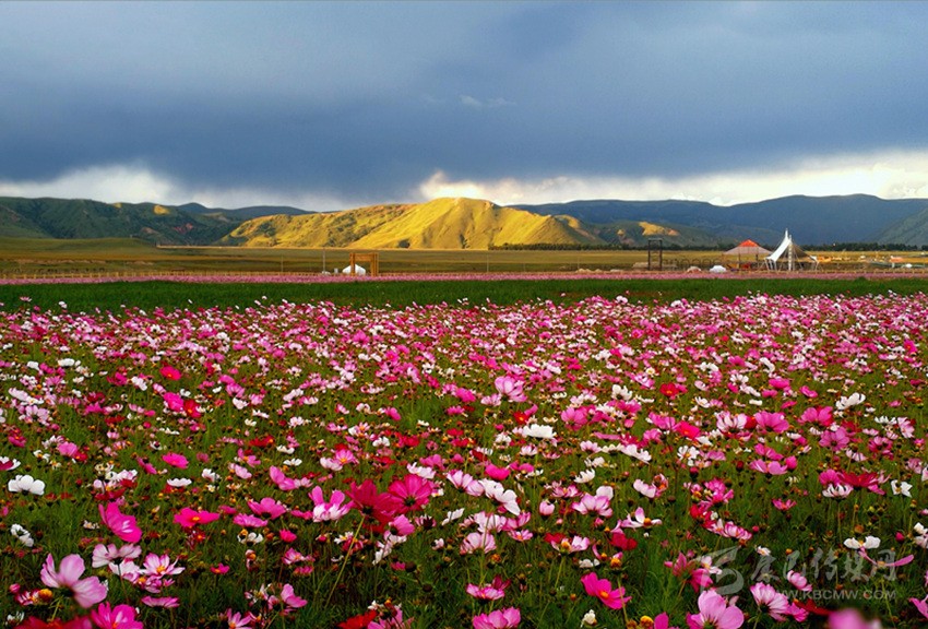 干凈、壯闊、深邃,藍天白云下,金露梅、波斯菊、峨眉薔薇……數(shù)十種花朵競相盛放、爭奇斗艷,一陣細風過后,群花緩緩搖擺,散發(fā)著縷縷清香。