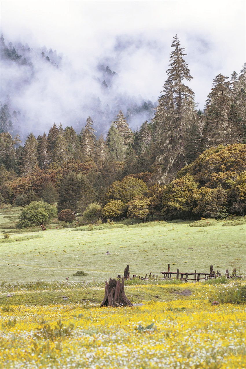 海子上游,分布大片的高山草甸,夏如綠毯,秋則金黃,河流以曲流的形態(tài),百折千回其中,河谷兩側的亞高山針葉林,密疏相宜,多變的色彩賦予它豐富的層次。