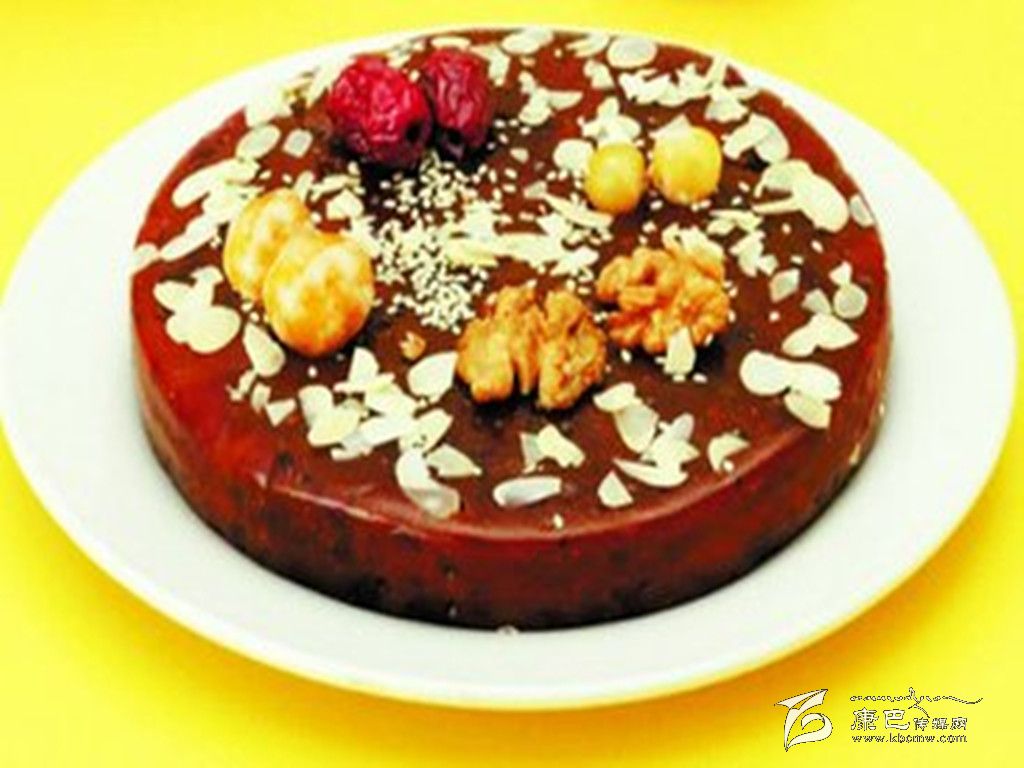八寶年糕 原料 糯米1000克,白糖、麻仁青梅、葡萄干、瓜條、白蓮、桃脯、豬油各20克。 做法 先將糯米淘洗干凈,水浸24小時(shí)后上蒸籠蒸爛,取出用木棒搗爛攤涼,把白糖等搓勻成餡,在方盤內(nèi)刷豬油,鋪上搗爛的1厘米厚的糯米飯,每鋪一層放入適量的餡,共鋪3層,蒸熟后用刀切為小塊即成。 夾心年糕 原料 糯米1000克,青紅絲、小豆、白糖各50克。 做法 將糯米洗凈浸泡24小時(shí)后上蒸籠蒸爛,取出用木棒搗爛后展切成2塊,把小豆煮爛加糖再加青紅絲做成餡撒于其中一塊上,再將另一塊放在餡上壓實(shí)壓緊,用刀切成塊即可。