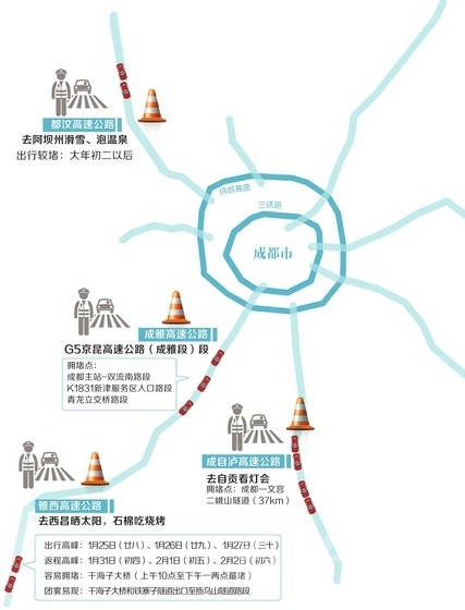 回成都如遇擁堵,交警建議,從瀘州、自貢出發(fā)回成都的車輛,可在成自瀘高速寶飛或仁壽站下高速,經(jīng)老成仁路返回成都;自貢、內(nèi)江的車輛不一定非要來(lái)擠成自瀘,可選擇樂(lè)自、宜瀘、樂(lè)宜高速返回成都。如果成都站出站車流量大,可選擇大林站、興隆站,從老成仁路、雙流錦繡東山快速通道到成都。