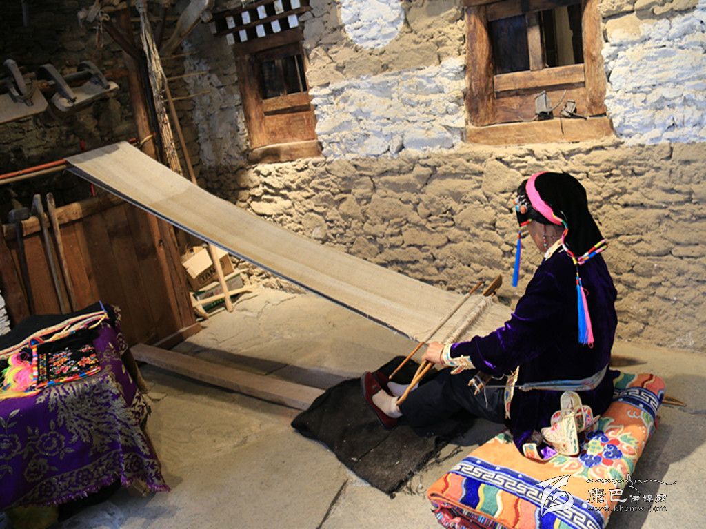 穿過古樸的大門,步入館中,映入眼簾的是古老的民間紡織技藝。一位藏族老阿媽端坐在古董般的織布機前,聚精會神地編織布匹,見到游人微笑回應,并未停下她手上的工作。年逾60的擁天秀,從十幾歲便學習織布,此間從未間斷。隨著紡織機逐漸被淘汰,擁天秀已成為傳承這門古老技藝的“活化石”。非遺展示館開館時,擁天秀主動表示,愿在此地免費為游客展示丹巴紡織技藝。 “我喜歡丹巴刺繡和紡織工藝,平時在家里也會做,現(xiàn)在眼睛不很好,所以刺繡沒有辦法做了。游客們很喜歡在這里看我織布,他們有什么問題,我都會給他們講解。”古老的嘉絨紡織技術(shù),通過擁天秀的雙手,漸漸被人們熟知,無數(shù)張游人與她的合影也被傳至網(wǎng)絡。經(jīng)她現(xiàn)場紡織,價值600元一匹的純手工布銷量也節(jié)節(jié)攀升,擁天秀研習多年的手工活在展示館中終于有了“用武之地”。