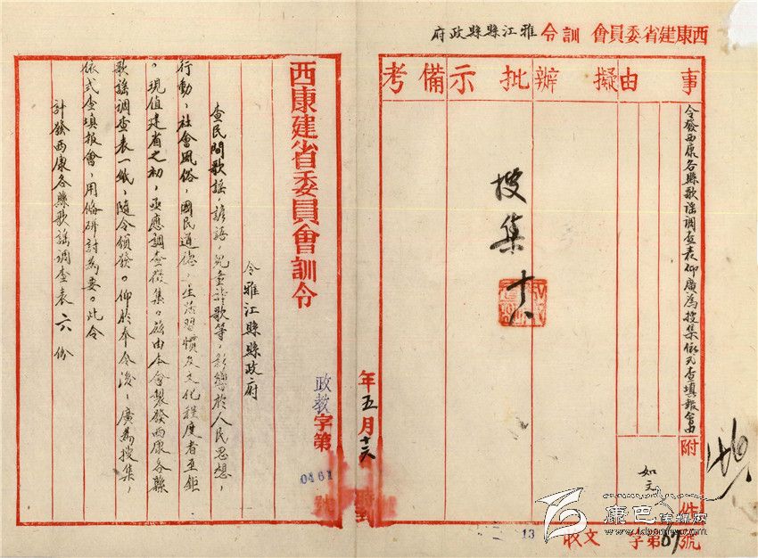 在舊檔案里翻出一份有劉文輝署名的訓令,這是在民國27年(即1938年)8月1日發(fā)往“西康雅江縣政府”的訓令,與其它多如牛毛的訓令不同的是,這份訓令竟然所說的事情是不為人們所重視的“歌謠”收集。