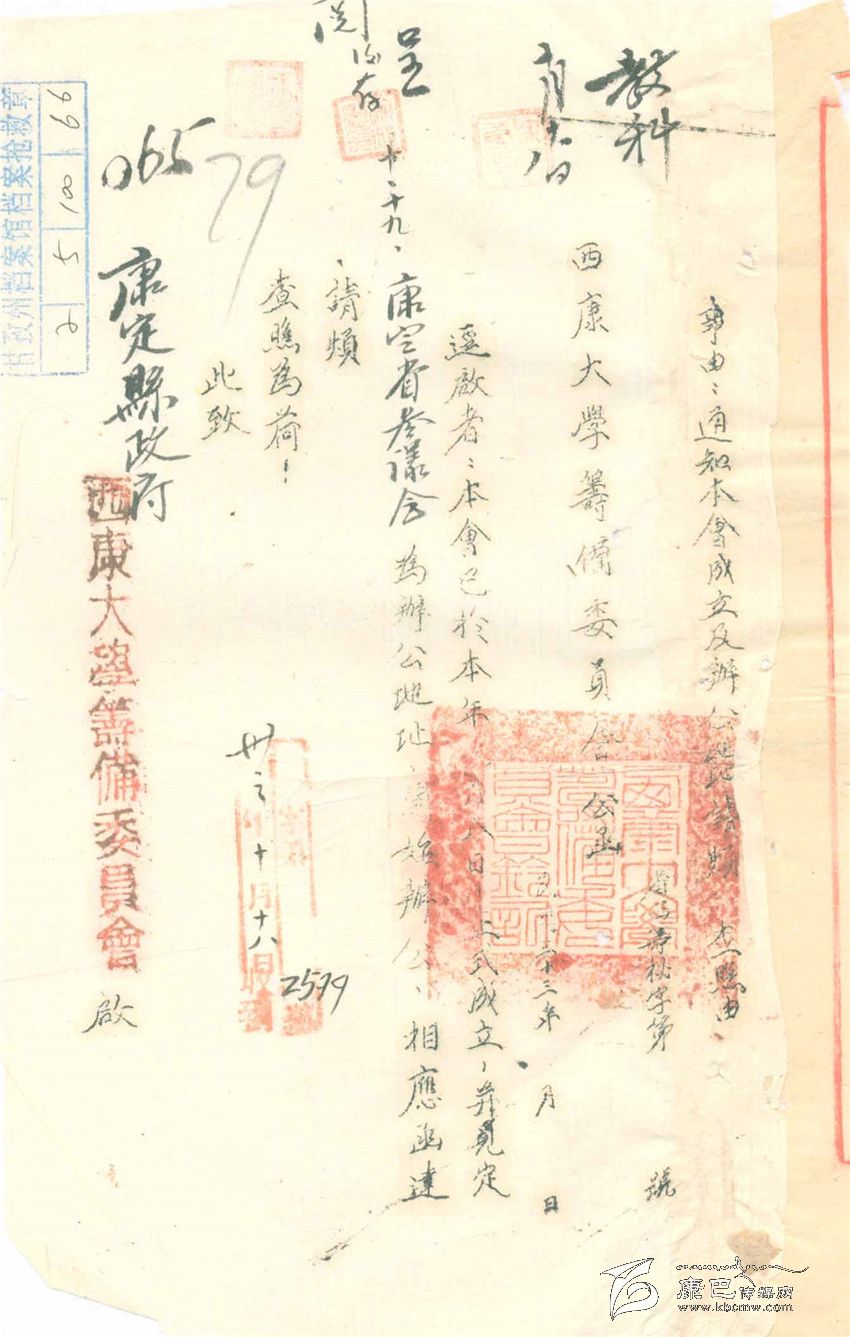 根據(jù)這份資料上“教科:10月18日”和“呈閱后存:10月19日”等字樣推算,這個(gè)“西康大學(xué)籌委會(huì)”可能是在10月8日成立的,這份函件是送往康定縣政府,告知“籌委會(huì)”辦公地點(diǎn)的一般函件。