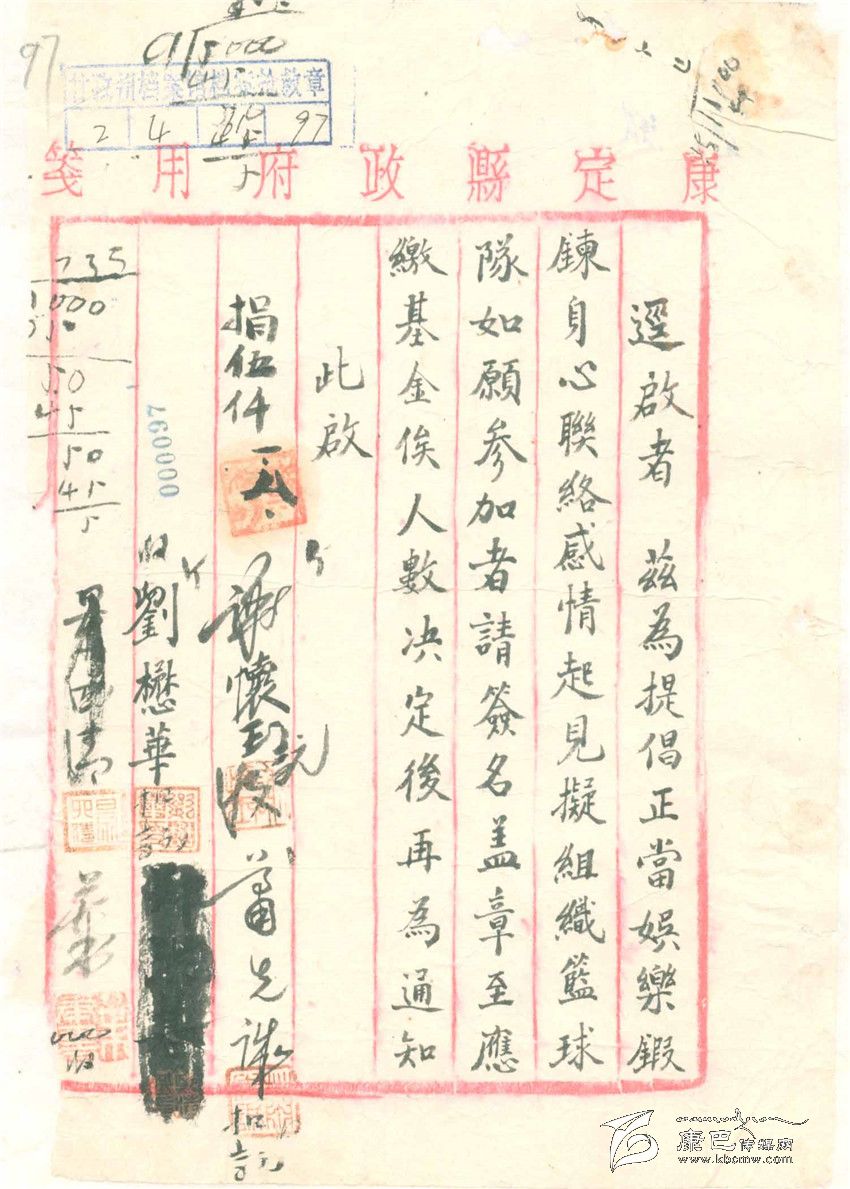 這是一張用解放前的康定縣政府便箋寫(xiě)的“啟事”,內(nèi)容是倡議成立一支籃球隊(duì)。在上面簽字的有十多個(gè)人,這十多人一定是籃球運(yùn)動(dòng)的愛(ài)好者。至于這支籃球隊(duì)后來(lái)是不是成立等等都不見(jiàn)下文。而且,從這張“啟事”上看不到這件事發(fā)生在哪一年,只有一位名叫李培清的人寫(xiě)下了收到捐款5700元、“三月三十日”的日期。最有意思的就是,在這張“啟事”上記下了的這句話:縣長(zhǎng)捐購(gòu)籃球款伍仟元。這句話起碼包涵了以下的意思,一,康定城里已經(jīng)興起了籃球運(yùn)動(dòng);二,成立籃球隊(duì)沒(méi)有專門(mén)的經(jīng)費(fèi),幸好人們有很高的積極性,連縣長(zhǎng)也主動(dòng)捐款,那些簽名后面隱約可見(jiàn)的數(shù)字也可能是捐款的數(shù)字。