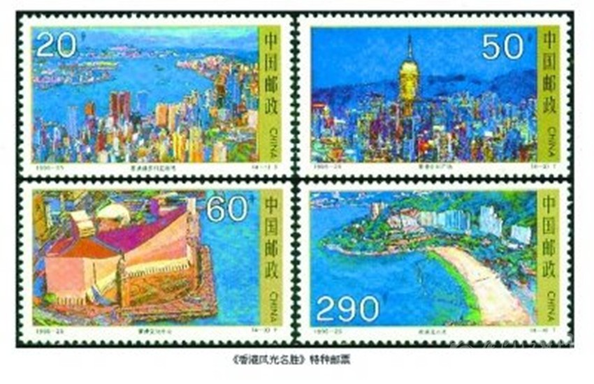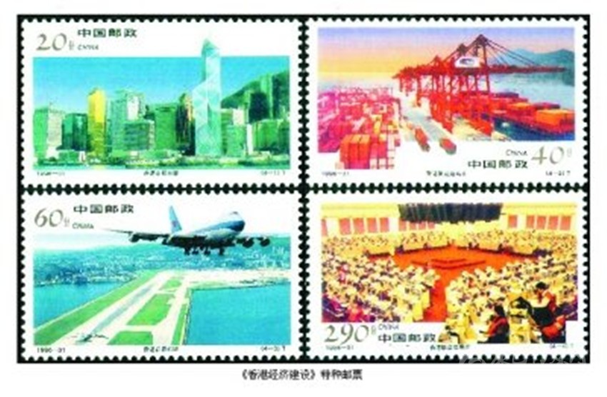 在香港回歸祖國的進程中,為了讓全國和世界人民認識香港,了解香港,我國相繼發(fā)行了兩套介紹香港風光名勝和經(jīng)濟建設(shè)的特種郵票。1995年11月28日,我國發(fā)行《香港風光名勝》特種郵票,全套4枚。圖案分別為“維多利亞港灣”“中環(huán)廣場”“文化中心”和“淺水灣”;1996年12月19日發(fā)行《香港經(jīng)濟建設(shè)》特種郵票,全套4枚。圖案分別為“香港中銀大廈”“香港集裝箱碼頭”“香港啟德機場”和“香港聯(lián)合交易所”。