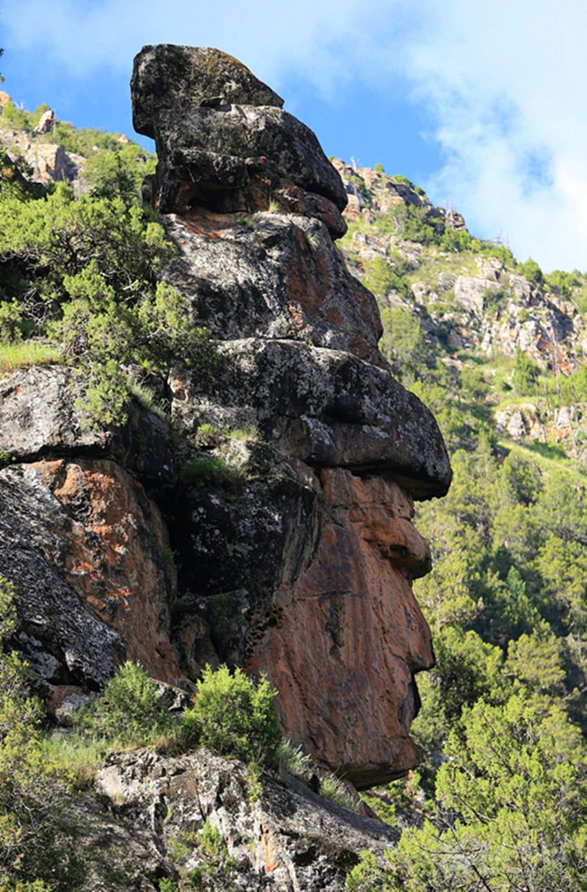 從多爾家溝口走7公里到日貢多時,在右側(cè)的山巖上發(fā)現(xiàn)了一處自然形成的人頭像。耳、眉、眼、口、鼻五官形象逼真,還穿戴著帽子和盔甲,第一眼看見就不禁聯(lián)想到格薩爾藏戲面具和格薩爾石刻中的格薩爾王形象。