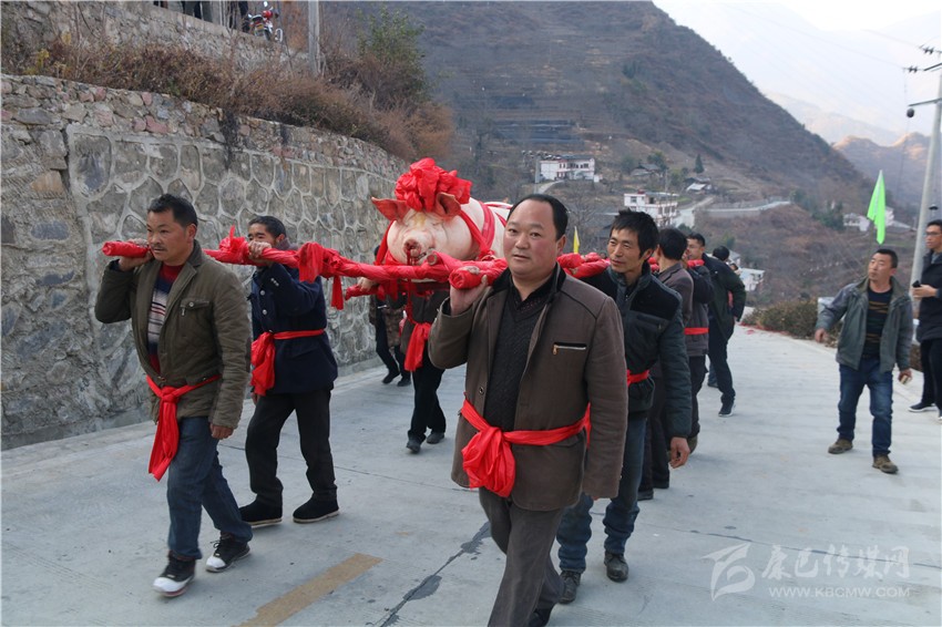 5個(gè)村民將年豬抬到秤上。360斤。村民為年豬準(zhǔn)備大紅花。準(zhǔn)備紙錢、香蠟。9點(diǎn)整,殺豬匠開始了他的工作,在眾人齊心協(xié)力下,光溜溜的年豬被打整干凈?!氨S游覀兇鍋砟觑L(fēng)調(diào)雨順、五谷豐登,村民平安健康?!贝逯欣险呔催^天地后,8個(gè)身強(qiáng)力壯的村民站在年豬旁,豎著拇指齊聲說,今年家家戶戶還要養(yǎng)大肥豬。抬著年豬,村里的中老年人簇?fù)碇?,走在最前面,唱著悅耳的民謠,大意是歌唱幸福生活的,迎著2018年的第一縷陽光,村民們喜氣洋洋。到村里來的游客蜂擁拍照。