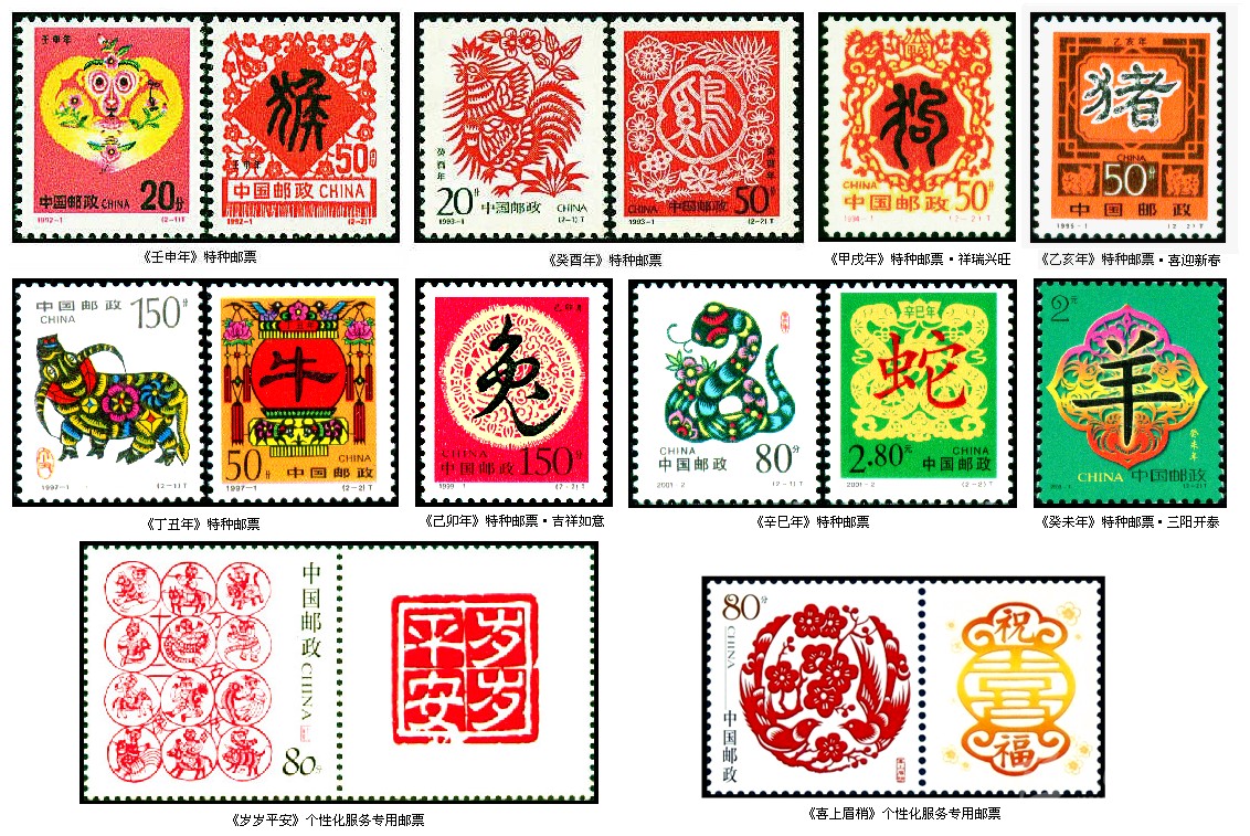 剪紙作為藝術(shù)百花園中的一朵奇葩,在我國(guó)郵票圖案設(shè)計(jì)中應(yīng)用也非常廣泛。由于傳統(tǒng)的民間剪紙有著濃郁的吉祥喜慶氣氛,因此在我國(guó)近些年發(fā)行的生肖郵票中多次出現(xiàn)剪紙藝術(shù)。在第二輪12套24枚生肖郵票中的剪紙圖案分別有1992年《壬申年》的“猴桃獻(xiàn)瑞”和“喜鵲登梅”、1993年《癸酉年》的“雄雞報(bào)曉”和“四季吉祥”、1994年《甲戌年》的第二枚“祥瑞興旺”、1995年的《乙亥年》的第二枚“喜迎新春”、1997年的《丁丑年》的“金牛奮蹄”和“牛耕年豐”、1999年《己卯年》的第二枚“吉祥如意”、 2001年《辛巳年》的“祥蛇祝?!焙汀跋檫\(yùn)普照”以及2003年的《癸未年》第二枚“三陽(yáng)開(kāi)泰”等。這些郵票中剪紙圖案有的直接取材于民間,有的則是在原作基礎(chǔ)上再創(chuàng)作。如“雄雞報(bào)曉”一枚,圖案選用的是河北省獻(xiàn)縣本齋鄉(xiāng)鄧家莊蔡蘭英老人的剪紙“百雞圖”中的一幅,而“金牛奮蹄”一枚,圖案是根據(jù)山東高密民間藝人齊秀花的剪紙“媳婦騎?!痹偌庸?chuàng)作而成的。在我國(guó)發(fā)行的祝福系列個(gè)性化服務(wù)專用郵票中也有吉祥喜慶的剪紙圖案,即2005年11月6日的《歲歲平安》和2005年11月11日的《喜上眉梢》等。