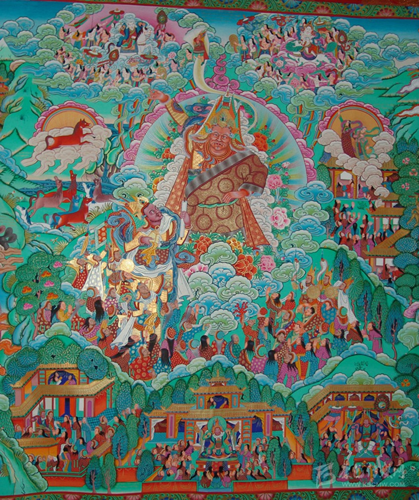 格薩爾唐卡,藏語叫“仲唐”?!爸佟奔础陡袼_爾》故事;“唐”即唐卡,“仲唐”就是畫有《格薩爾》內容的唐卡畫。那么,唐卡與古老的藏族英雄史詩《格薩爾》之間又有什么聯系呢?作為民間文學的史詩《格薩爾》主要靠民間藝人的說唱得到繼承和廣泛流傳。為了加強說唱時的效果,一些聰明的藝人就以《格薩爾》為題材,繪制人物畫和格薩爾故事,類似佛教繪畫中的佛本生故事和高僧大德的畫傳,說唱時把它們懸掛起來,邊解釋,邊演唱。這種演唱形式,被稱作“指畫說唱”。這就是有關《格薩爾》最早的唐卡?!耙划嬕皇澜纭?,在說唱藝人們看來,在一幅并不很大也算不上很精美的唐卡里,整個大千世界、英雄格薩爾的輝煌業(yè)績,都包括在里面了。久而久之,成為一種專門的類型,稱作“仲唐”——畫有格薩爾故事的唐卡。