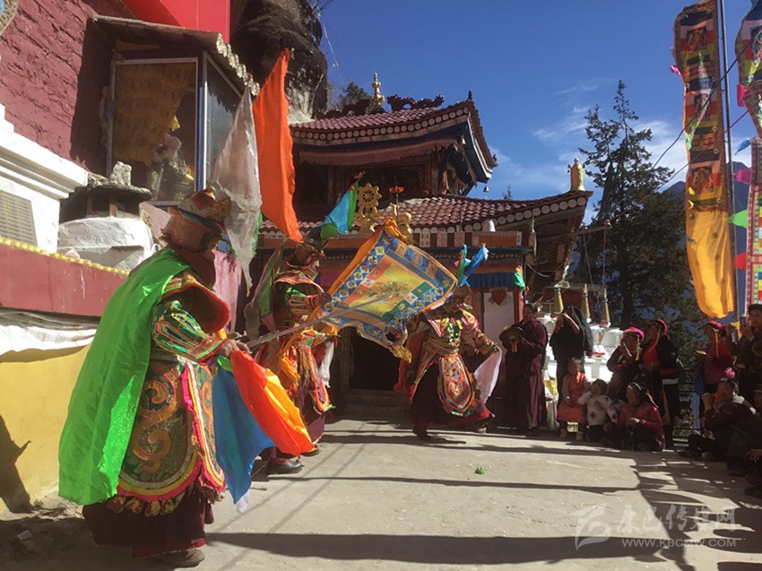 趁著等待的時間,我們來到寺院前的壩子里。寺院的壩子長約十米,寬約兩米,非常的袖珍。在壩子的邊沿上,站滿了前來朝圣的人們。壩子里,法號陣陣、海螺聲聲,幾位頭戴面具、披著戰(zhàn)袍、手拿寶劍的喇嘛正在為人們演繹藏戲《格薩爾王》。在鼓點的指引下,他們或騰挪,或舞動,或跳躍,金戈鐵馬的戰(zhàn)爭場面躍然眼前。