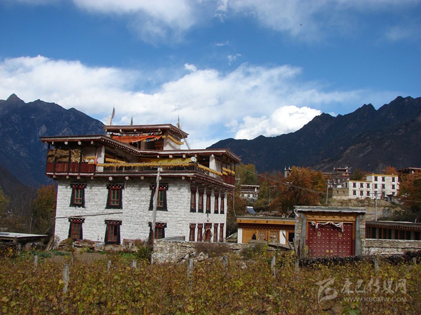 當(dāng)翻過一處斷崖,眼前豁然開朗。一大片平整的田地出現(xiàn)在我們的面前。田地里,一棟棟白色的藏房或鶴立雞群,或三五聚集,看似毫無規(guī)律,其實從整個房屋大門的朝向可以看出,在房基的選擇時,對陽光的接納面、風(fēng)水等都作了充分的考慮。