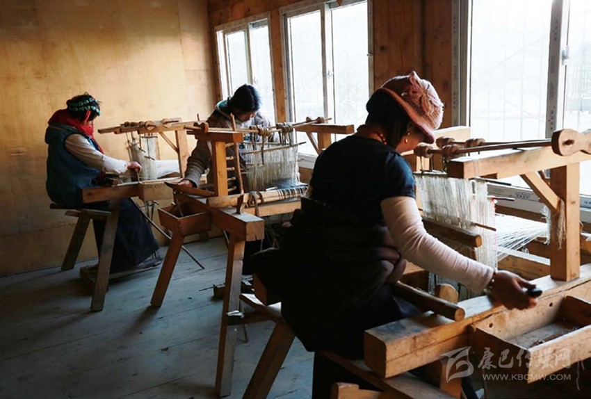 2003年,“編織班”邀請(qǐng)澤巴姆為老師,將這項(xiàng)技藝傳承了下來(lái)?,F(xiàn)在,澤巴姆年紀(jì)大了,牛羊毛絨編織這樣繁復(fù)又耗體力的事情她不再做了,全交給了自己的媳婦扎西巴姆——當(dāng)?shù)匚ㄒ坏呐Q蚪q編織老師。第二天,我們?cè)诰幙棸嗟墓し焕镆?jiàn)到了扎西巴姆。工坊一角的木架上擺著為數(shù)不多的圍巾、墊毯等產(chǎn)品,窗邊平行擺著六臺(tái)織機(jī),扎西巴姆正帶著幾個(gè)藏族婦女坐在其間飛梭走線(xiàn)。陽(yáng)光從窗戶(hù)透進(jìn)來(lái),投射在織機(jī)和織女們身上,古老的場(chǎng)景、緩慢的節(jié)奏恍惚把我?guī)Щ亓俗婺傅臅r(shí)代。扎西巴姆說(shuō),當(dāng)?shù)厝朔Q(chēng)牦牛絨為