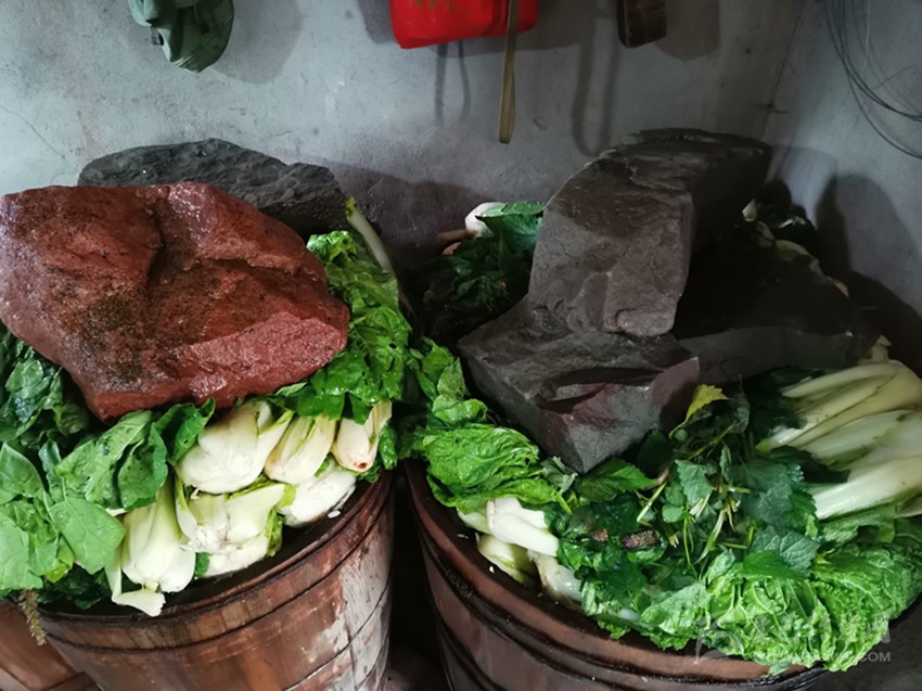 舊時(shí)化林坪家家都做鹽菜炒臘肉,為何李汝珍卻能在周家客棧的灶上烹調(diào)出這獨(dú)一份美味呢,原因就在這鹽白菜上面。據(jù)周家后人講述,李汝珍當(dāng)年對(duì)鹽白菜的制作頗為在行,從選材、抹料到腌制、晾曬,每個(gè)步驟每一種材料都非常講究。她用作腌菜的食材需葉片長(zhǎng)肉質(zhì)厚的半包心本地大白菜,花椒粉則選用麻香味醇的漢源花椒,所需之水必須為本地山泉,她還特意在腌制時(shí)加入茴香苗、藿香葉等香料,在木桶或水缸上以巖石加壓更是匠心獨(dú)具。精心制作的鹽白菜,常常晾曬于客棧屋檐下或墻外各處,以其醇香之味吸引客人前來(lái)。久而久之,周家客棧鹽白菜的美味之名被背夫們帶到各地,“鹽白菜炒臘肉”也成了茶馬古道上的一道名菜。