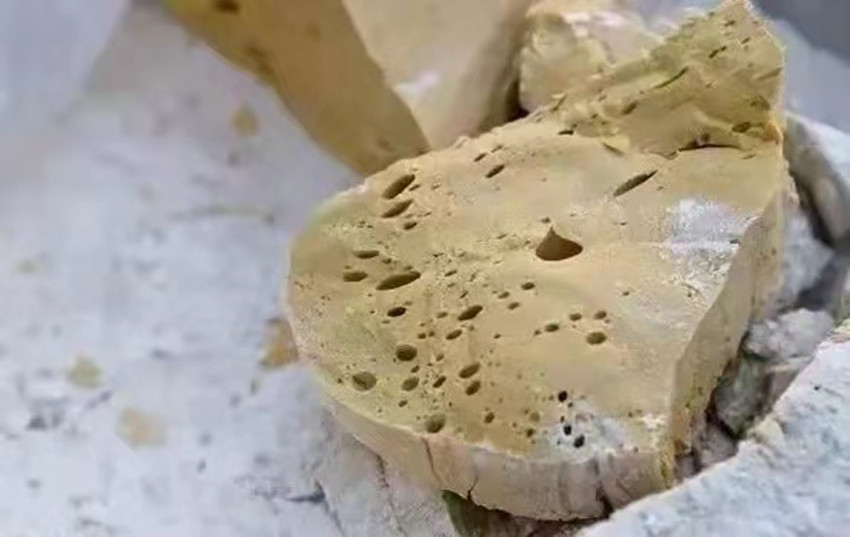 只聽大伯一聲大喝“出糖”,便有人迅速端過(guò)鋪有一層熟面粉的簸箕,大伯退到一旁休息,二伯眼疾手快拿起瓢便把黏稠的糖漿往簸箕中舀。