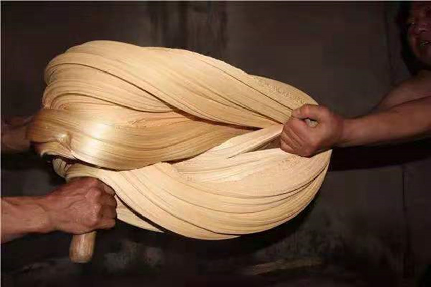 扯糖也是熬糖過(guò)程中十分關(guān)鍵的一個(gè)環(huán)節(jié)。剛出鍋的糖溫度可達(dá)兩三百度,徒手是不敢去觸碰的,扯糖需等到麻糖變得溫?zé)岵拍苓M(jìn)行,但又必須在它完全冷卻之前完成整個(gè)扯糖工序,否則等麻糖徹底冷卻就會(huì)變得僵硬無(wú)比。休息少頃,只見三叔熟練的用粘著面粉的手從盛放麻糖的簸箕中扯下三四斤左右的一團(tuán)麻糖,左手拿糖右手持杖(類似于搟面杖的木棍)作出扯糖的姿勢(shì),此時(shí)四叔拿著早已準(zhǔn)備好的沾了面粉的木棍將三叔的手中的麻糖攔腰別住,用力均勻的拉扯麻糖,三叔則在原地扎樁站穩(wěn),一手持杖作拉扯狀,一手微微扶住想要往下掉的糖尾,經(jīng)過(guò)幾次折疊和來(lái)回拉扯,麻糖變得均勻細(xì)長(zhǎng),兩人合力將扯好的麻糖平穩(wěn)的放在鋪有熟面粉的大簸箕中靜待冷卻。間隙二叔和父親又重復(fù)著扯糖的動(dòng)作,很快將一團(tuán)糖餅扯成糖帶。經(jīng)過(guò)拉扯后麻糖中間會(huì)形成很多的空洞,吃起來(lái)酥脆香甜。