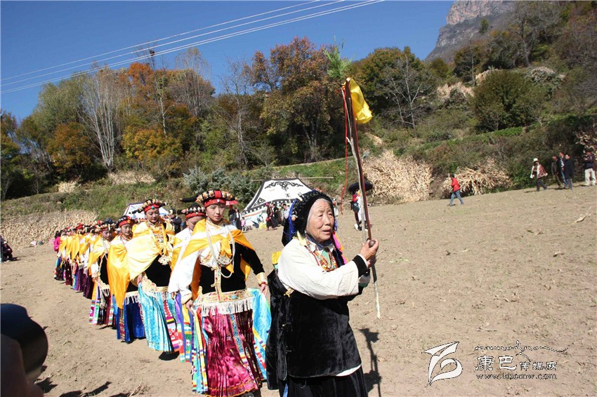 所有的祈福儀式結(jié)束后,村子里一位德高望重的長輩走上圓臺,用雄渾有力的嗓音向場地外等候的人們發(fā)出指令。在一段念詞結(jié)束之后,參加成人儀式女孩們的父親們在一位老人的指引下緩緩的向場地中央走來,老人手舉一幅一米高的唐卡畫,口中念念有詞,走在他后面的父親們一襲白色的毪衫,頭戴一頂灰色的禮帽,腳穿紅黑相間的藏靴,頸上掛著一根潔白的哈達(dá),滿臉肅然的緊隨老人之后,來到月形的臺子邊,站成一個半圓形。當(dāng)父親隊(duì)站定后,母親隊(duì)們也向場地中移步而來,本次成人儀式的主角們在一位老阿媽的帶領(lǐng)下向場地中走來,每一位女孩穿著打扮都是那么的光鮮靚麗,每一個人都顯得美麗動人,她們披著黃色的披風(fēng),一根白色的哈達(dá)在胸前打著結(jié),五顏六色的哈達(dá)懸掛在這根哈達(dá)上,在姑娘們的后背迎風(fēng)飄飛。走到圓臺邊,小女孩們也圍成半圓,低著頭,等待著喇嘛們的念經(jīng)祈福和家人的祈福。此時,兩位吉祥老人站了起來,手中拿著凈瓶,走到姑娘們面前,一邊念誦經(jīng)文,一邊將手中凈瓶里的水倒在姑娘們的手心里,姑娘們則虔誠的將這圣水輕輕的抹在自己的額頭上,寓意吉祥如意。待喇嘛主持儀式結(jié)束后,主持儀式的老人用嘉絨語向蒼天和墨爾多神山祈禱,希望神賜予孩子們美麗的面容和美好的心靈,從今日起,她們就可以真正的長大成人了。吉祥詞念誦完后,母親們排著長長的隊(duì)伍緩緩來到孩子們的面前,將懸掛在胸前的哈達(dá)取下,久久的凝視著女兒的臉,眼角掛著幸福的淚水,用顫抖的聲音為女兒祈福,叮囑孩子們要孝敬父母,做一個正直善良的人,然后,才將白色的哈達(dá)掛在女兒的頸上,父親們則站在原地,看著母親們將哈達(dá)和祝福送給女兒,見證著女兒們的長大成人。接受完父母和長輩們的祝福之后,盛大的鍋莊舞會開始了。小女孩們也跟隨著這些舞者們手牽著手走到場地中央,跳起歡快的鍋莊舞。擁忠大娘說,成年禮上的鍋莊舞會一般都要視參加成人禮儀式女孩們親戚多寡而定,每一名長輩都會走到場地中牽頭,跳起舞蹈,這時候是女孩的長輩們炫耀舞技和歌聲的時候,他們矯健的舞步和甜美的歌喉迎來眾人的和鳴。