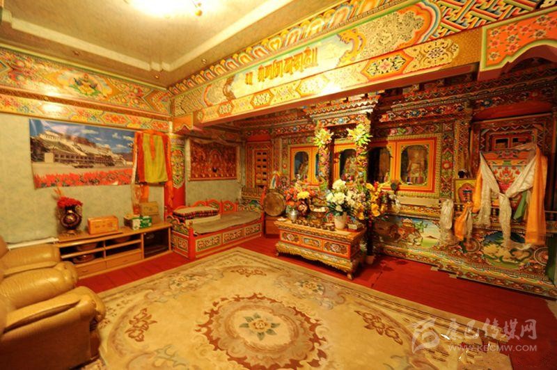 藏族居室一般分臥室、客廳、經(jīng)堂和廚房等部分。室內(nèi)陳設(shè)與裝飾如藏式建筑學(xué)者葉啟燊所言:“主次分明,重點(diǎn)突出。主室較為復(fù)雜而樸素,經(jīng)堂偏于華麗而清幽,其余各室均較簡(jiǎn)單。室內(nèi)都不施粉刷,但有個(gè)別的經(jīng)堂作雕刻裝飾;土司和喇嘛上層的經(jīng)堂則會(huì)作油漆的彩畫(huà)?!辈貐^(qū)不論是農(nóng)牧民住宅還是貴族上層府邸都有供佛的設(shè)施,經(jīng)堂屬于凈地,是專門供奉神佛的,因此,一般不作他用;主室是藏族住宅中最重要的一個(gè)房間,也是功能最多的房間,其中有生活、睡眠、飲食等所需的爐灶、壁櫥、壁架、矮桌、火盆等。這些藏式家具的布置安放,早已形成一定之規(guī)。