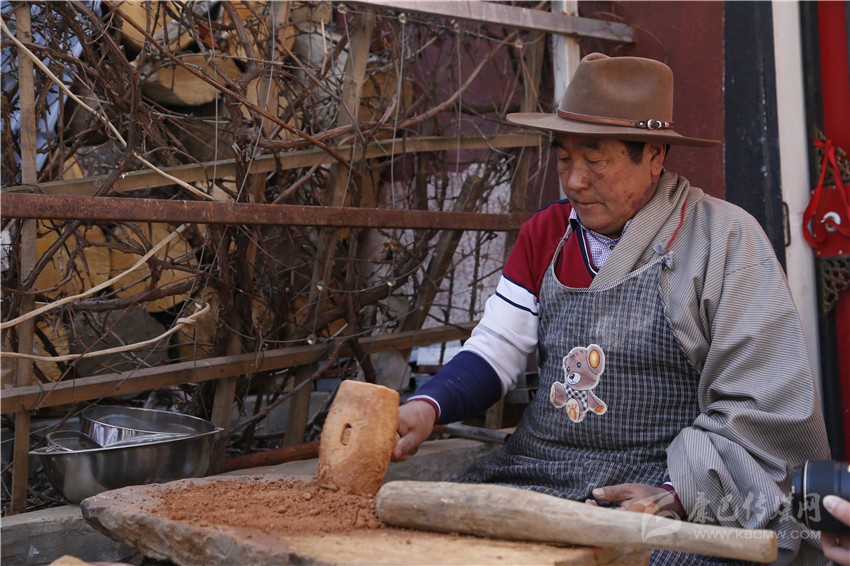 清晨,大師背起背簍和鋤頭來(lái)到海拔4000米以上的山上挖泥,挖泥前要舉行簡(jiǎn)單的祭祀儀式,用脫水的松柏枝和酥油糌粑混合燃燒。裊裊清香彌漫在山間,這時(shí)大師用鋤頭挖著制作藥泥面具的泥土,泥土分為紅色雌泥和白色雄泥,雌雄兩種泥土結(jié)合后具有一定的硬度,以此制作的面具不會(huì)出現(xiàn)裂開的情況,同時(shí)保證配方藥不變質(zhì)。