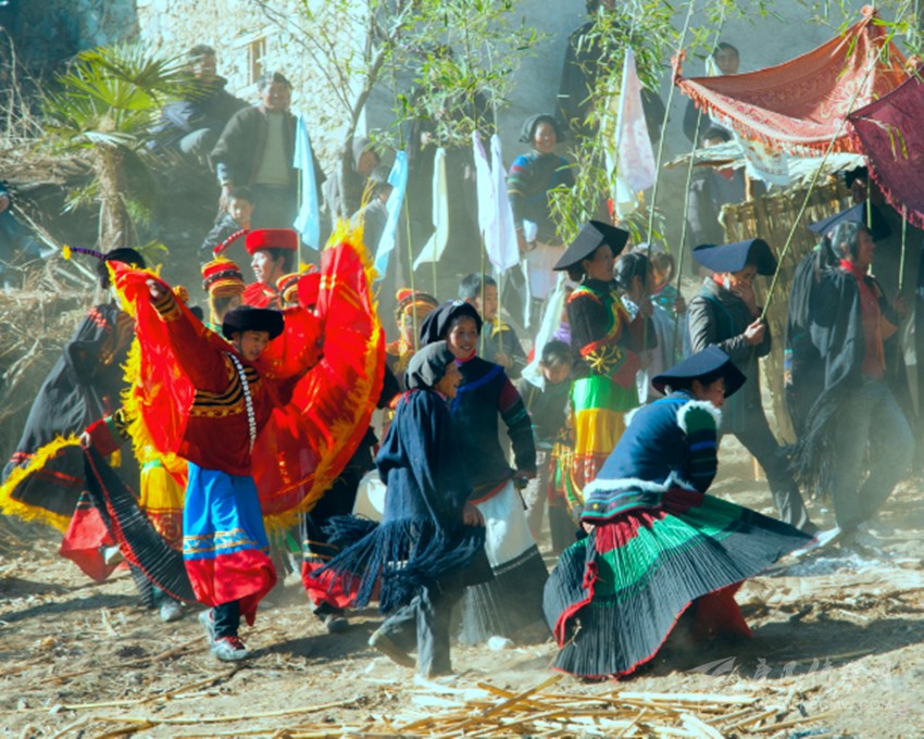 我?guī)е纸o我準備的迎親酒向李木坪走去。我激動、欣慰,然而也深感惶恐不安。激動欣慰的是我就要看到我日夜思念的新娘了,惶恐不安的是我怕被新娘的“近衛(wèi)軍”們捉住,罰酒背新娘。護送新娘到男方家完婚的全都是清一色的男性,有新娘的長輩、哥哥、弟弟、表兄弟等等。按彝家的風俗,新郎如果在戒備森嚴中摸到新娘,就讓“近衛(wèi)軍”們乖乖地把新娘背到新郎家里;如果摸不到,不僅新郎被罰酒,而且新郎還得老老實實把新娘背到家里。罰酒、背新娘倒不在乎,就怕站在遠處看熱鬧的小伙和姑娘們奚落一通,說摸不到新娘是沒本事的新郎。