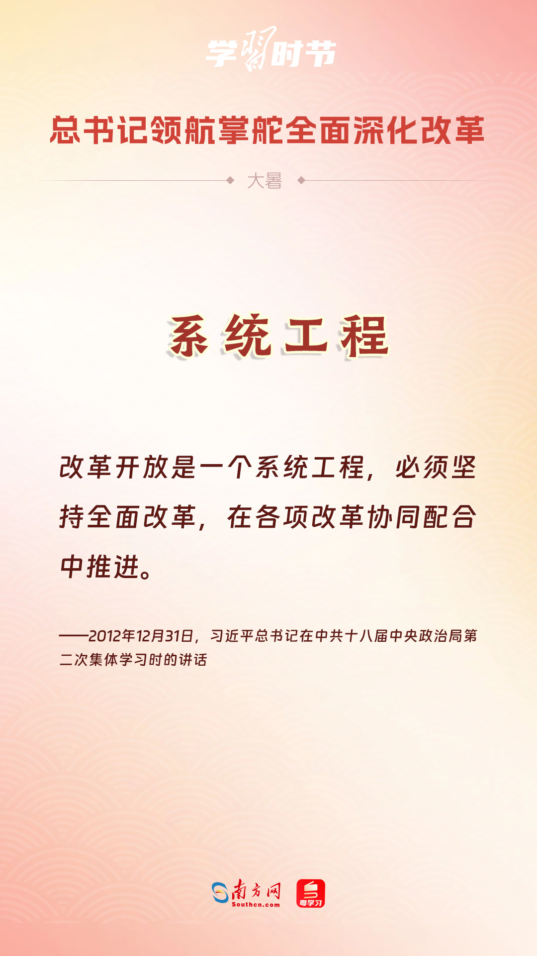 黨的十八大以來,習(xí)近平總書記親自領(lǐng)導(dǎo)、親自部署、親自推動(dòng)全面深化改革工作,推動(dòng)全面深化改革事業(yè)在攻堅(jiān)克難中不斷邁上新臺(tái)階、取得新勝利。在驕陽似火的大暑時(shí)節(jié),通過一組海報(bào),讓我們共同學(xué)習(xí)習(xí)近平總書記關(guān)于“全面深化改革”的重要論述。
