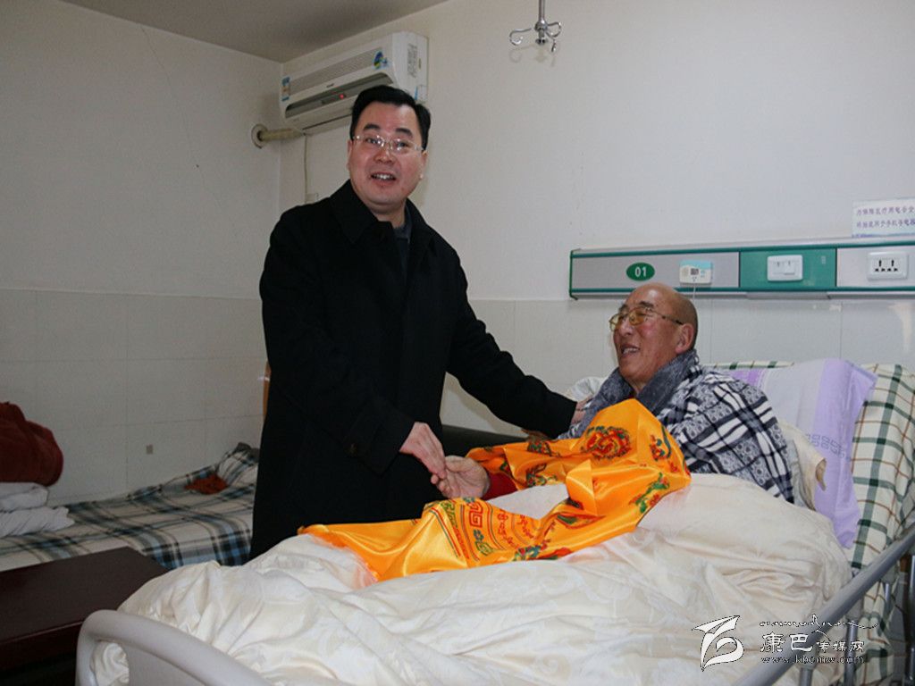 上午10時許,胡昌升來到醫(yī)院病房,與香根活佛的家屬和醫(yī)務(wù)人員一一握手,并走到香根活佛病床前,送上哈達和慰問金,俯身親切地握著他的手,關(guān)切地詢問其身體狀況。“病情有沒有好轉(zhuǎn)?”“身體現(xiàn)在還有哪些地方感覺不舒服?”“每天要輸幾次液?做幾次理療?”“有沒有人在醫(yī)院照顧你?”“住院期間有什么困難沒有?”一句句貼心的話語,充滿了關(guān)懷之情,猶如一股股暖流涌動在香根活佛和在場每個人的心間。大家雖身處寒冬,卻感覺暖意融融。