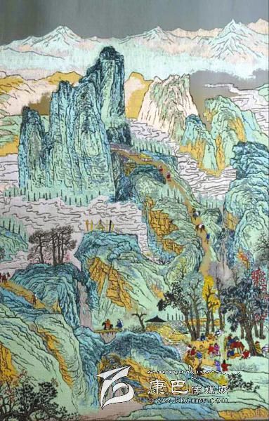 在蜀錦蜀繡展覽館中,由蜀錦大師馬德坤,蜀繡大師鄔學(xué)強(qiáng)共同創(chuàng)作大型錦繡作品《南方絲路圖》,吸引不少游客駐足。該作品天空部分的藍(lán)色由深及淺,并逐步過渡到表現(xiàn)地面的泥金色。同時(shí),利用絲織品的透光性,使遠(yuǎn)山和近景形成強(qiáng)烈對比,大大地增強(qiáng)了畫面的縱深感。