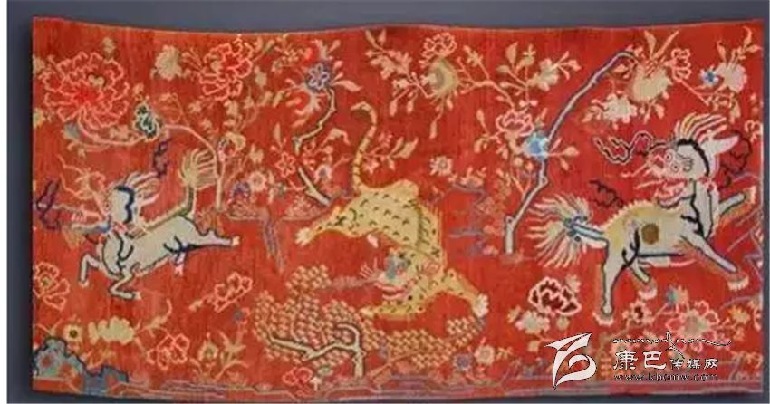 織制有麒麟、老虎和獅子的彩色掛毯寓意著福、祿、壽,是從前達(dá)官顯貴們重要家裝飾品之一。此掛毯上的動(dòng)物與花朵造型古樸,雖然已歷經(jīng)歲月,然而色澤依舊鮮艷如初。