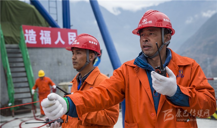 圖為施工人員通力合作讓導(dǎo)索精準(zhǔn)跨越大渡河。胡廷輝 攝