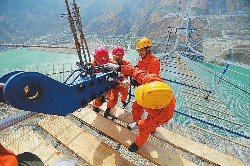 經(jīng)過2小時的牽引施工,4月5日,雅康高速公路重點(diǎn)控制性工程、被稱為“川藏第一橋”的瀘定大渡河興康特大橋首根主纜索股成功架設(shè),跨越大渡河“鎖定”在康定、雅安境內(nèi)的錨碇上。特大橋上部構(gòu)架主體工程施工由此正式啟動,甘孜藏區(qū)迎來首條高速大通道指日可待。