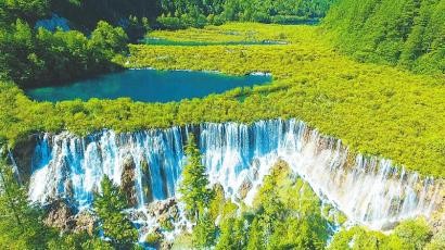 重建實踐彰顯生態(tài)理念——九寨溝景區(qū)內,尊重自然、綠色修復的舉措不勝枚舉。地震后,諾日朗瀑布出現一條16.8米長的裂縫,僅剩一股急流。景區(qū)就地取材,用地震中垮塌的鈣化物來填補“漏水”的裂縫,豐水期時,諾日朗瀑布恢復了昔日壯觀景象。