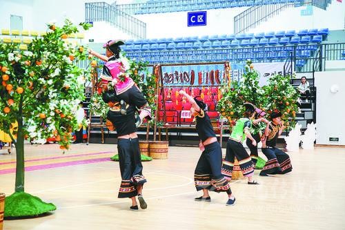 雅安市代表團(tuán)教練李鏡文告訴記者,《石炯諧博》表演項(xiàng)目依托當(dāng)?shù)匾图颐袼?,在黃果柑豐收的季節(jié),石棉縣彝族小伙、姑娘們?cè)诠掷锊烧S果柑時(shí)所產(chǎn)生的勞動(dòng)趣味競技活動(dòng)的演繹,反映了少數(shù)民族地區(qū)經(jīng)濟(jì)發(fā)展、社會(huì)繁榮穩(wěn)定、各族人民安居樂業(yè)的生活和精神風(fēng)貌。