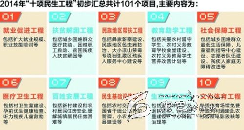 在征求各級部門、基層群眾意見的基礎上,今年“十項民生工程”已初步匯總101個項目,主要有:就業(yè)促進工程,包括擴大就業(yè)規(guī)模、職業(yè)技能培訓等;扶貧解困工程,包括城鄉(xiāng)困難群眾醫(yī)療救助、困難職工救助等;民族地區(qū)幫扶工程,包括大小涼山禁毒專項治理、藏區(qū)殘疾人服務中心建設等;教育助學工程,包括農村義務教育學校食堂建設等;社會保障工程,包括志愿者隊伍建設、殘疾人家庭無障礙改造等;醫(yī)療衛(wèi)生工程,包括孕前優(yōu)生健康檢查、聽力殘疾兒童救助等;百姓安居工程,包括農村居民住房安全、緩解城鎮(zhèn)居民住房困難等;民生基礎設施工程,包括國省干線公路養(yǎng)護管理等;生態(tài)環(huán)境工程,包括耕地質量建設、中小河流治理等;文化體育工程,包括體育場館免費開放等。
