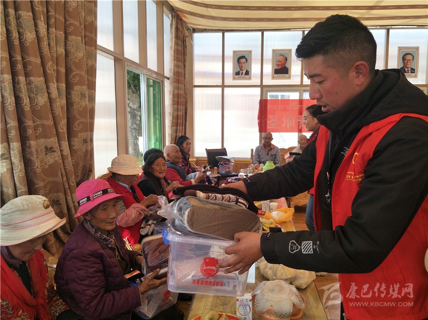 索郎達(dá)吉為老人發(fā)放御寒物資。