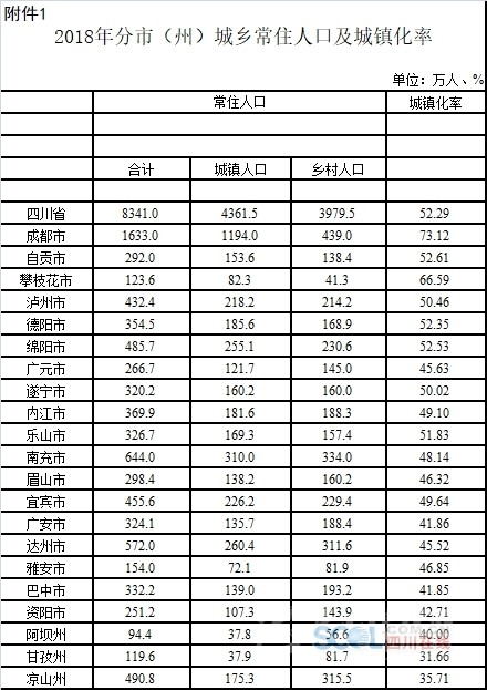 3月19日上午,四川省人民政府新聞辦公室召開(kāi)新聞發(fā)布會(huì),發(fā)布2018年四川省人口統(tǒng)計(jì)公報(bào)。四川新聞網(wǎng)記者從會(huì)上獲悉,四川省公安廳提供的數(shù)據(jù)顯示,2018年末全省戶籍人口9121.8萬(wàn)人,其中城鎮(zhèn)人口3271.5萬(wàn)人,鄉(xiāng)村人口5850.3萬(wàn)人,戶籍人口城鎮(zhèn)化率35.87%。
