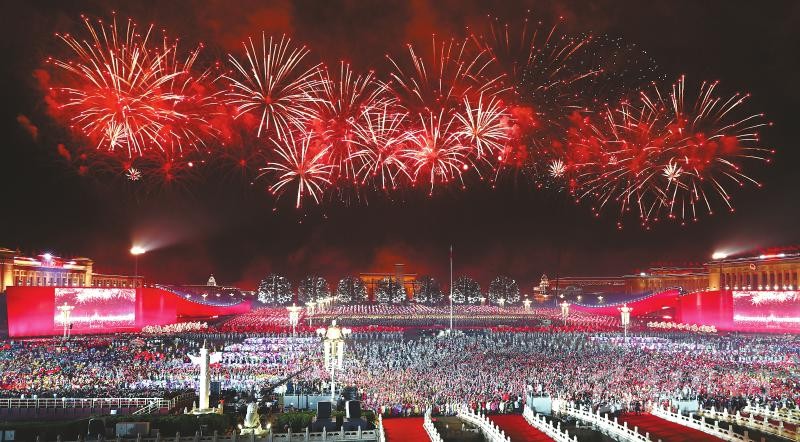此刻,萬花綻放,“人民萬歲”造型照亮廣場,照亮每個人的臉龐。