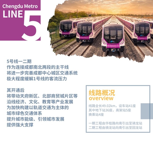 其中,5號線一二期作為連接成都南北兩段的主干線,將進一步完善成都中心城區(qū)交通系統(tǒng),極大程度緩解1號線的客流壓力,其開通后將帶動天府新區(qū)、北部商貿(mào)城片區(qū)等沿線經(jīng)濟、文化、教育等產(chǎn)業(yè)發(fā)展,為加快構(gòu)建以軌道交通為主體的城市綠色交通體系,提升城市能級、引領城市發(fā)展提供強大支撐。