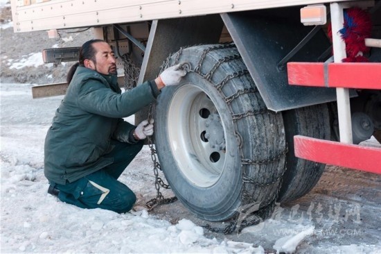 其美多吉在途中幫助社會車輛安裝防滑鏈(資料照片)。其美多吉是中國郵政甘孜縣分公司郵運(yùn)駕駛組的一名郵車司機(jī),往返在甘孜縣與德格縣之間。這段路程是四川省甘孜州綿延5866公里、平均海拔超過3500米的雪線郵路最危險的一段。新華社發(fā)(周兵 攝)