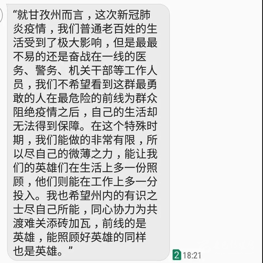 由于工作繁忙,陳永強并未出現(xiàn)在捐贈現(xiàn)場,通過短信他這樣說道: