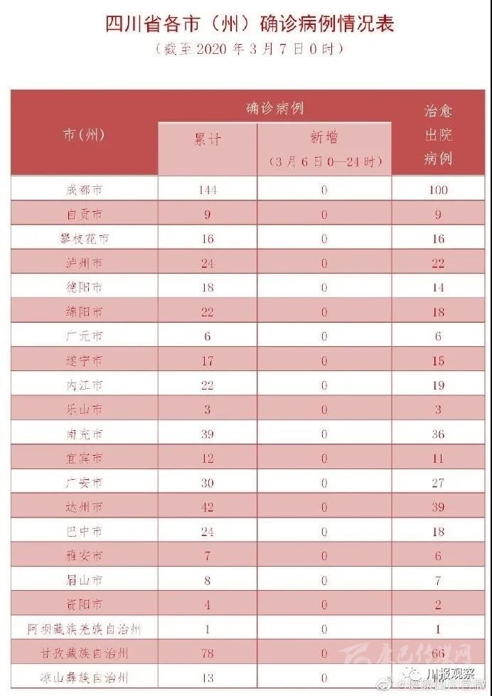 各縣(市)確診病例情況表 疫情實(shí)時(shí)追蹤 (截至2020年3月6日24時(shí))縣(市) 累計(jì)病例 新增病例 道孚縣 73 0 康定市 2 0 色達(dá)縣 2 0 稻城縣 1