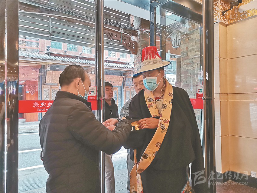 色達(dá)縣演出隊(duì)入住邦金麥朵酒店。每天,酒店安保人員多扎準(zhǔn)時(shí)出現(xiàn)在門口,提醒演職人員測量體溫、佩戴口罩?!拔沂蔷频甑牡谝魂P(guān)卡,拉姆是第二關(guān),我倆相互配合,表演節(jié)目的客人住得放心,演出的節(jié)目才會(huì)更加精彩?!蹦弥w溫槍,多扎一臉自豪地說。