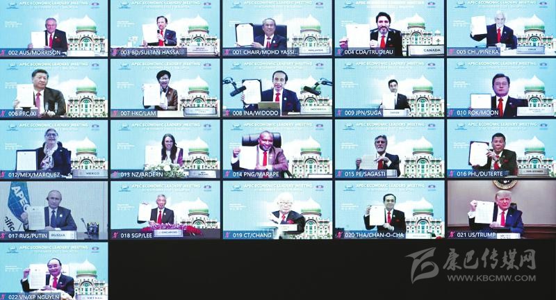 這是與會(huì)各經(jīng)濟(jì)體領(lǐng)導(dǎo)人、代表通過(guò)《2040年亞太經(jīng)合組織布特拉加亞愿景》并線上合影。新華社記者 李響 攝